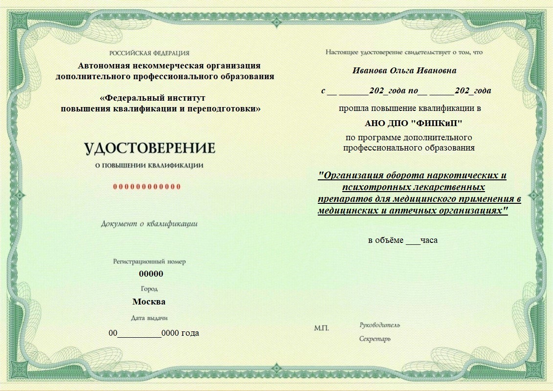Организация оборота наркотических и психотропных лекарственных препаратов для медицинского применения в медицинских и аптечных организациях (108ч). Повышение квалификации дистанционно.