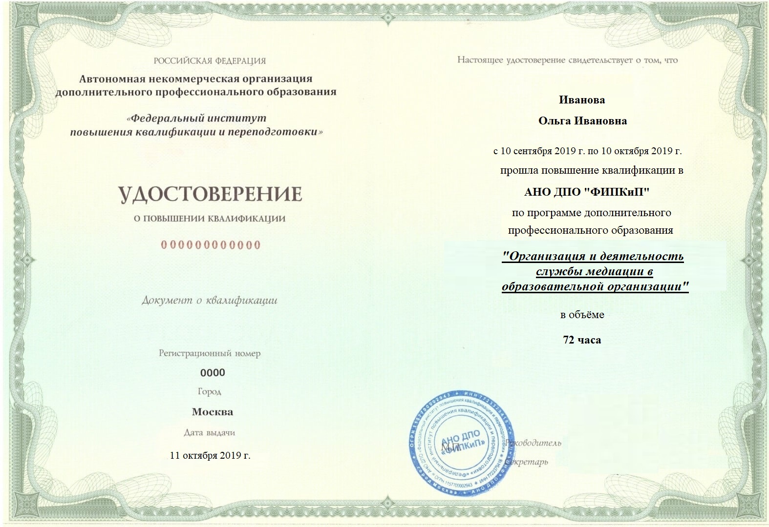 Удостоверение о повышении квалификации.