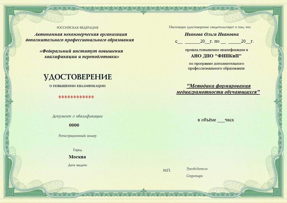 Методика формирования медиаграмотности обучающихся. Повышение квалификации дистанционно.