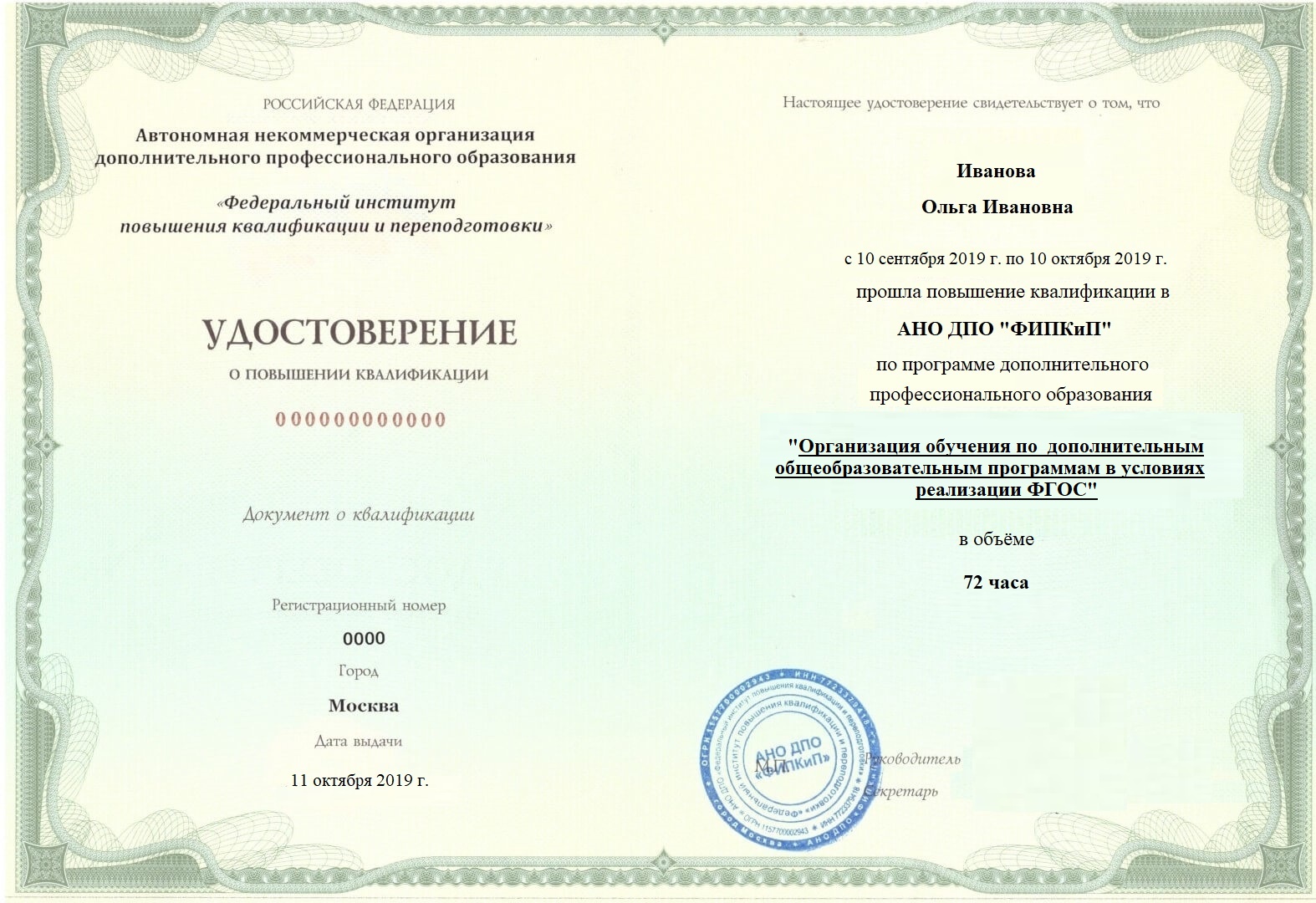 Удостоверение о повышении квалификации.