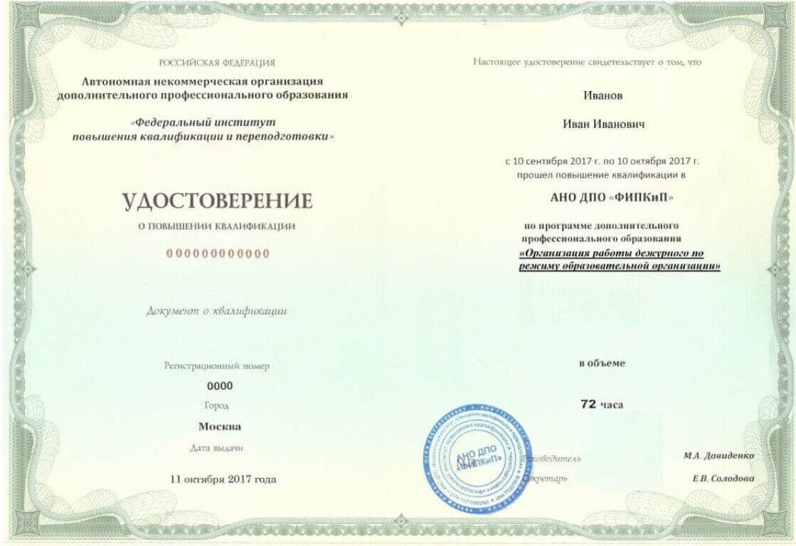 Удостоверение о повышении квалификации.