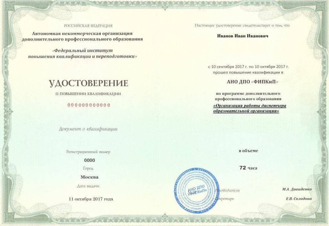 Удостоверение о повышении квалификации.