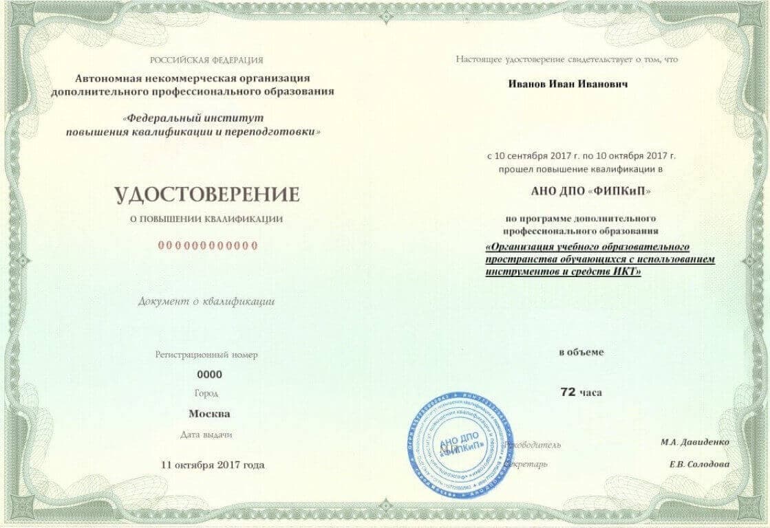 Удостоверение о повышении квалификации.