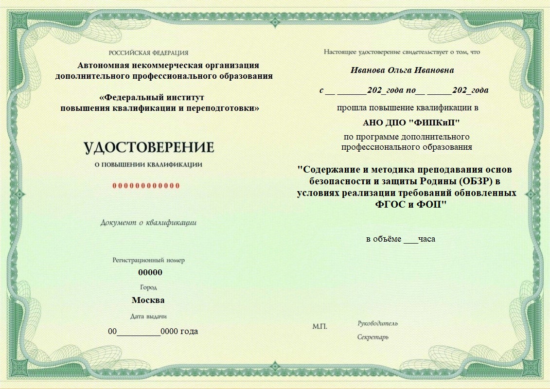 Содержание и методика преподавания основ безопасности и защиты Родины (ОБЗР) в условиях реализации требований обновленных ФГОС и ФОП. Повышение квалификации дистанционно