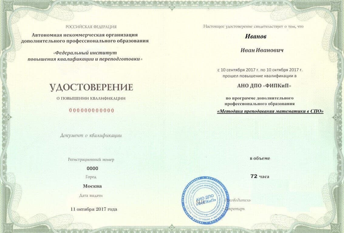 Удостоверение о повышении квалификации, дающее право на ведение профессиональной деятельности в избранной сфере.