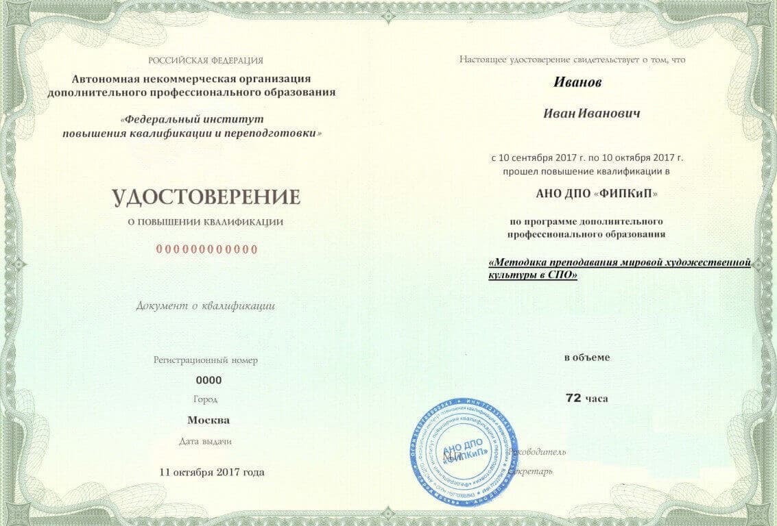 Удостоверение о повышении квалификации, дающее право на ведение профессиональной деятельности в избранной сфере.