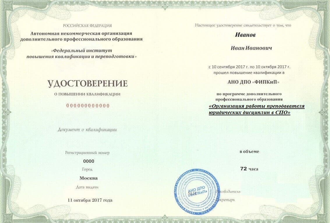 Организация работы преподавателя юридических дисциплин в СПО. Повышение квалификации дистанционно.