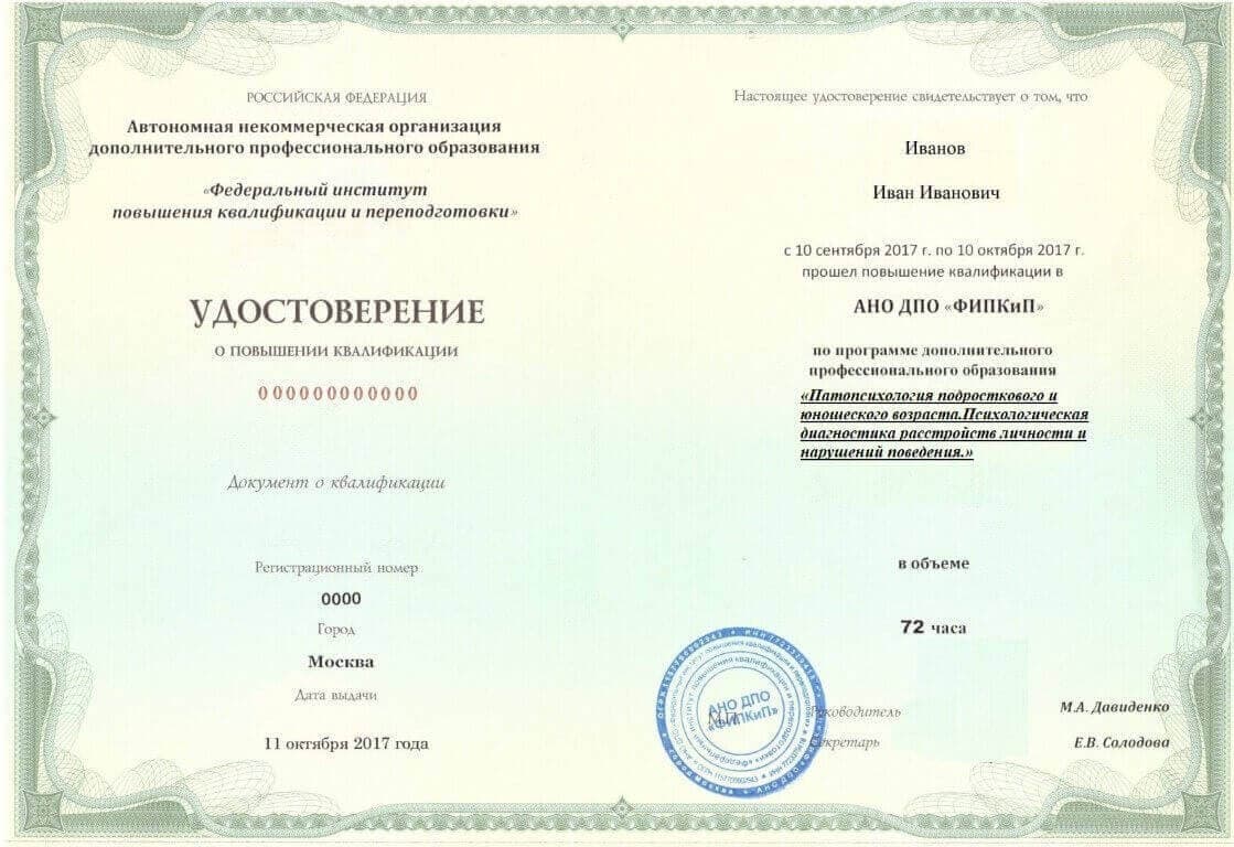 Удостоверение о повышении квалификации, дающее право на ведение профессиональной деятельности в избранной сфере.