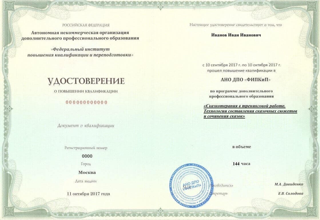 Удостоверение о повышении квалификации, дающее право на ведение профессиональной деятельности в избранной сфере.