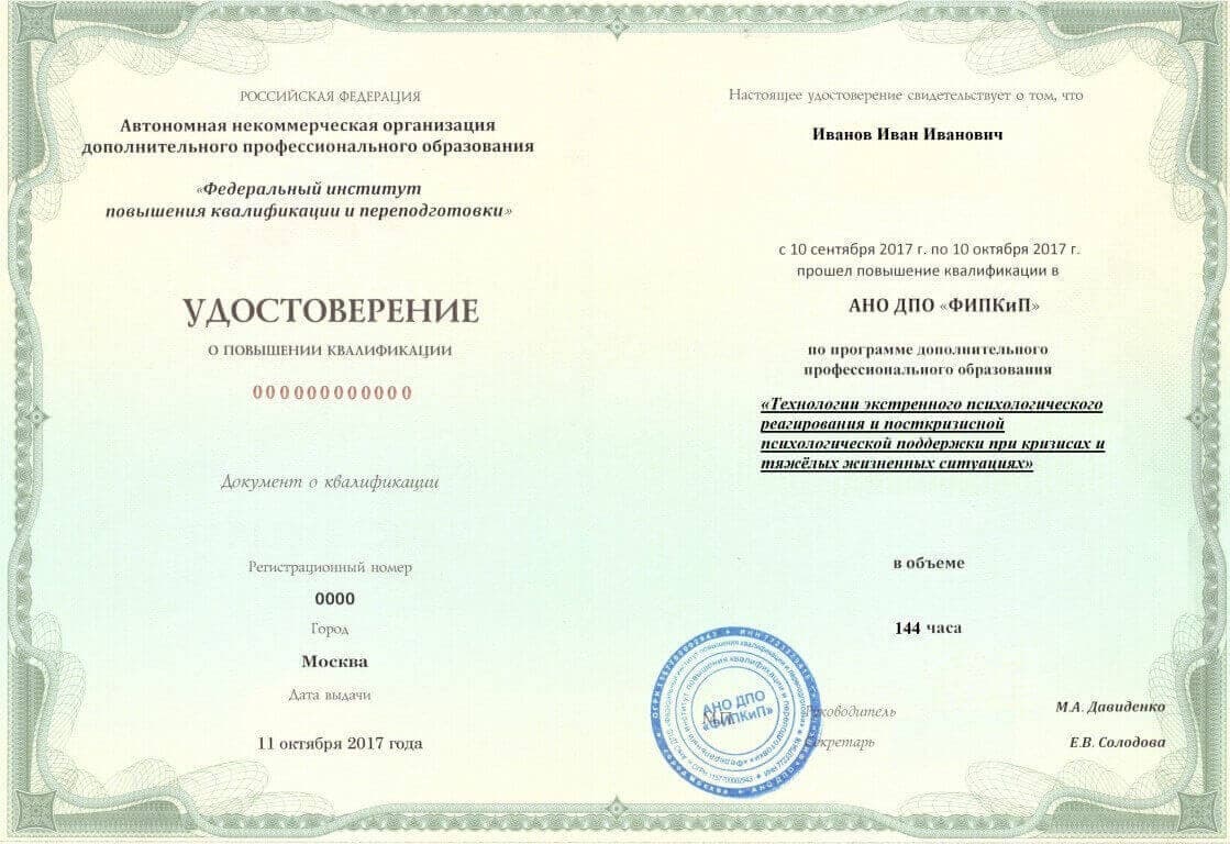 Удостоверение о повышении квалификации, дающее право на ведение профессиональной деятельности в избранной сфере.