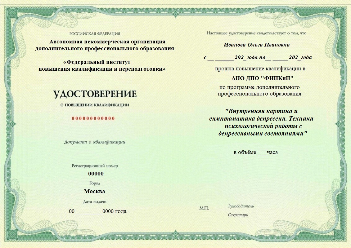 Удостоверение о повышении квалификации, дающее право на ведение профессиональной деятельности в избранной сфере.