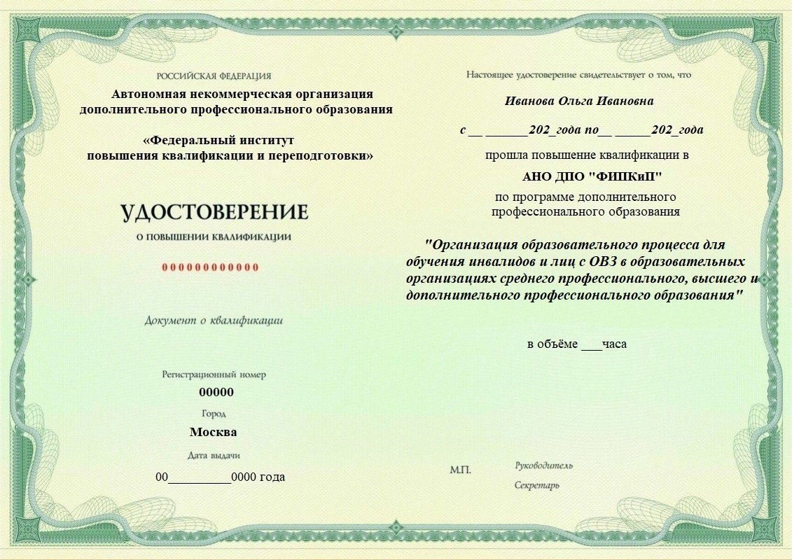 Удостоверение о повышении квалификации, дающее право на ведение профессиональной деятельности в избранной сфере.
