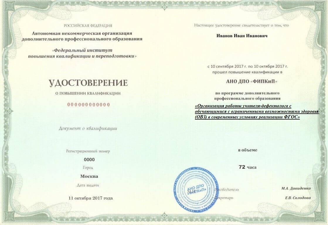 Удостоверение о повышении квалификации, дающее право на ведение профессиональной деятельности в избранной сфере.