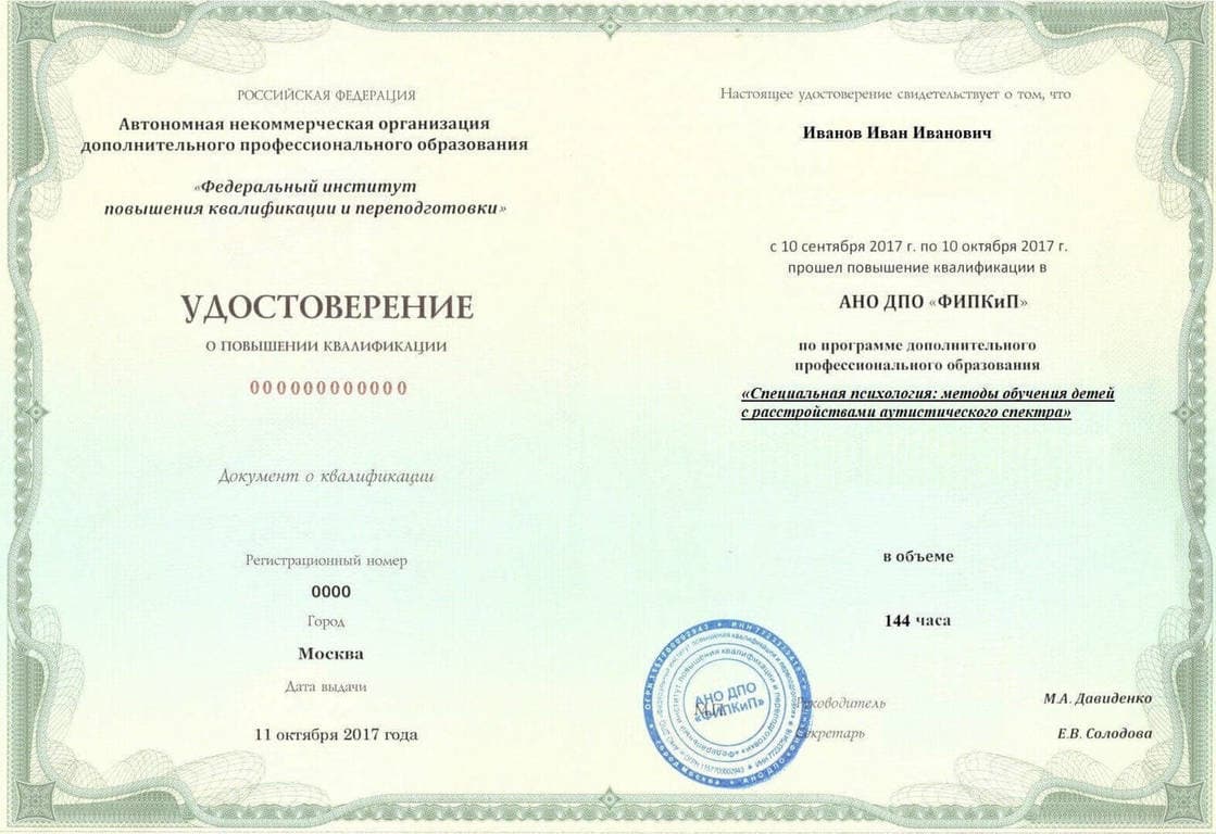 Удостоверение о повышении квалификации, дающее право на ведение профессиональной деятельности в избранной сфере.