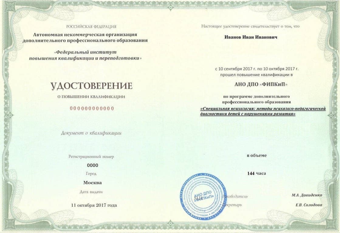 Удостоверение о повышении квалификации, дающее право на ведение профессиональной деятельности в избранной сфере.