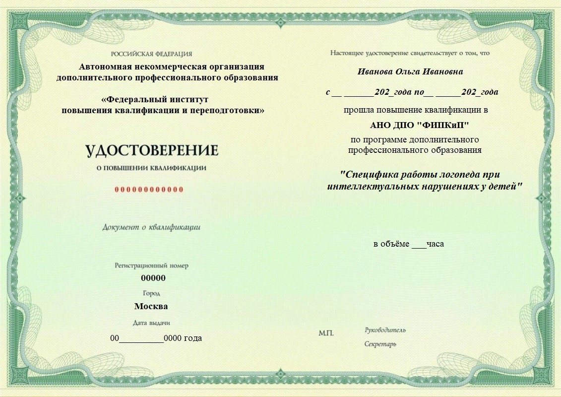 Удостоверение о повышении квалификации, дающее право на ведение профессиональной деятельности в избранной сфере.