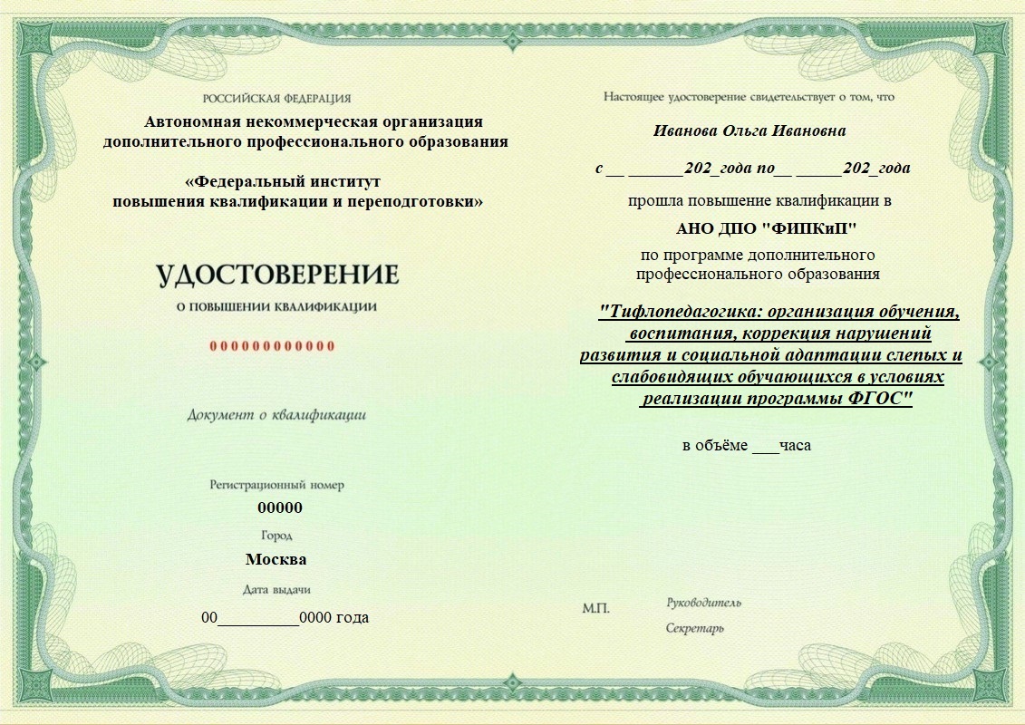 Удостоверение о повышении квалификации, дающее право на ведение профессиональной деятельности в избранной сфере.