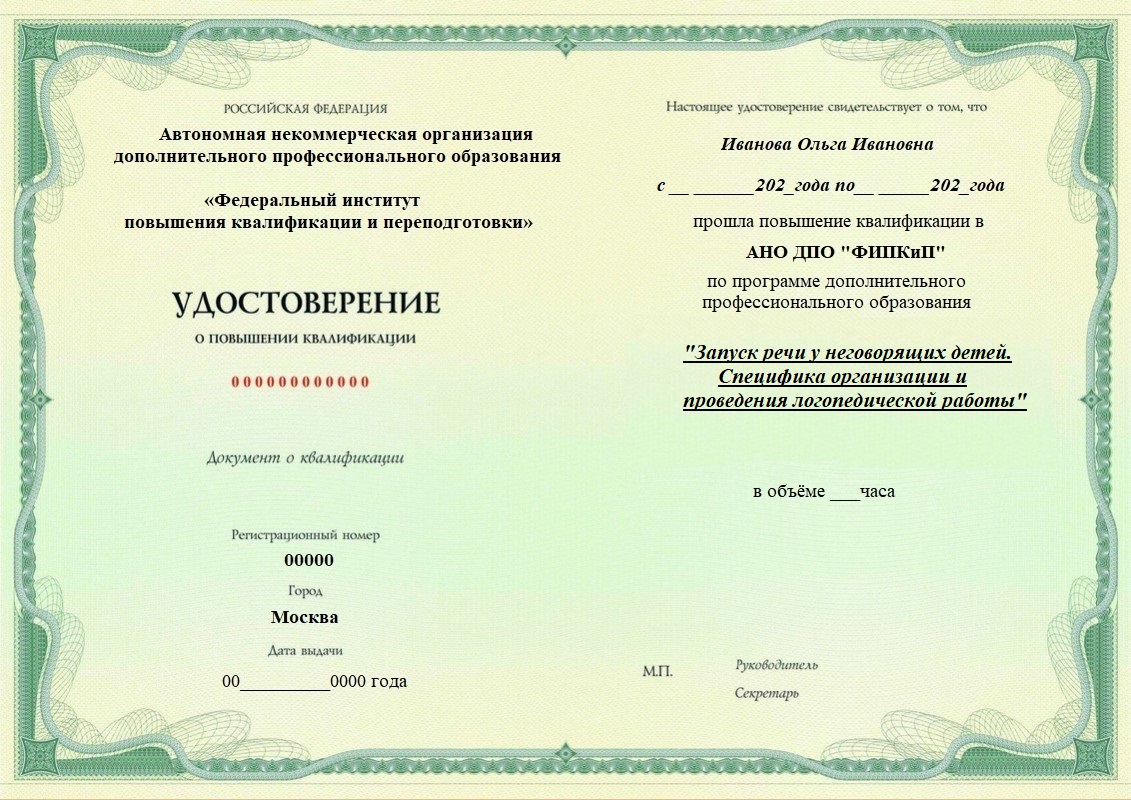 Удостоверение о повышении квалификации, дающее право на ведение профессиональной деятельности в избранной сфере.