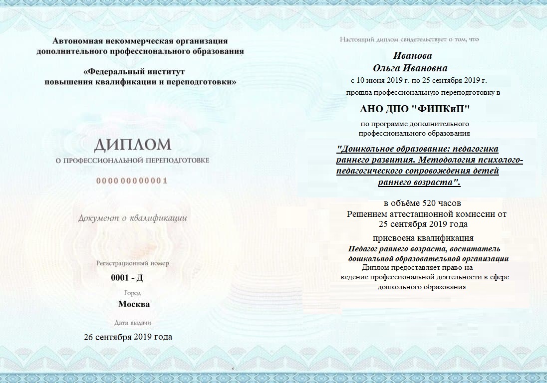 Диплом о профессиональной переподготовке, дающий право на ведение профессиональной деятельности в избранной сфере.