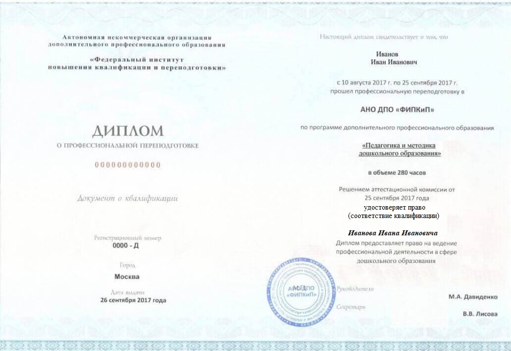 Диплом о профессиональной переподготовке, дающий право на ведение профессиональной деятельности в избранной сфере.