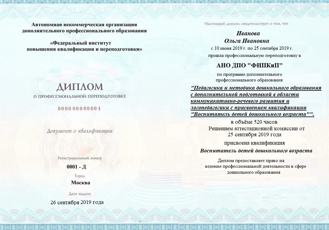 Диплом о профессиональной переподготовке, дающий право на ведение профессиональной деятельности в избранной сфере.