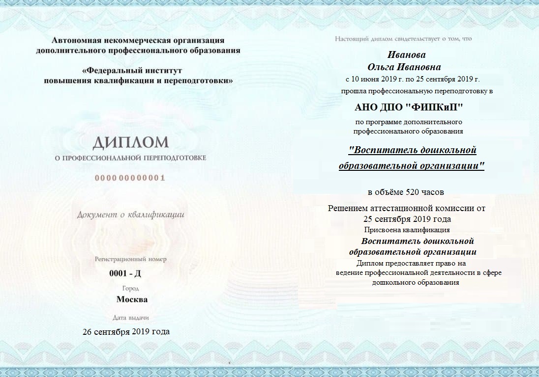 Диплом о профессиональной переподготовке, дающий право на ведение профессиональной деятельности в избранной сфере.