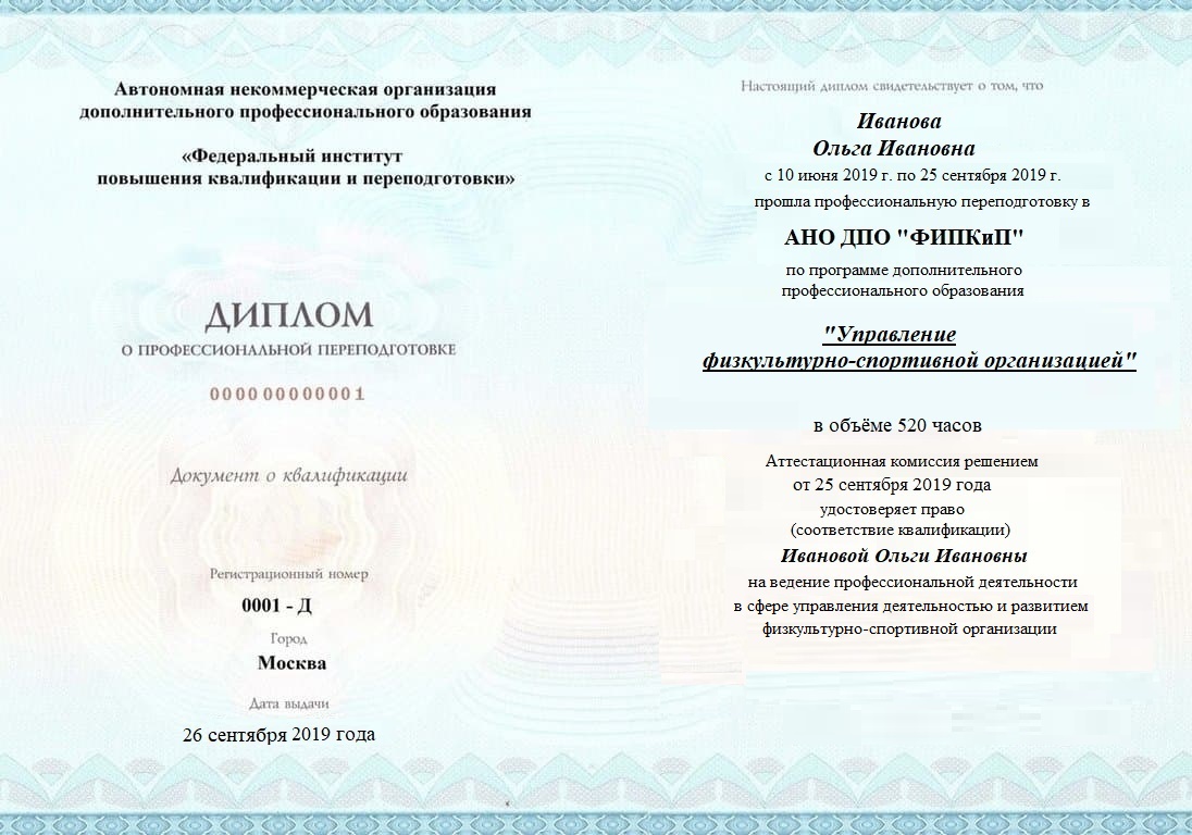 Диплом о профессиональной переподготовке, дающий право на ведение профессиональной деятельности в избранной сфере.