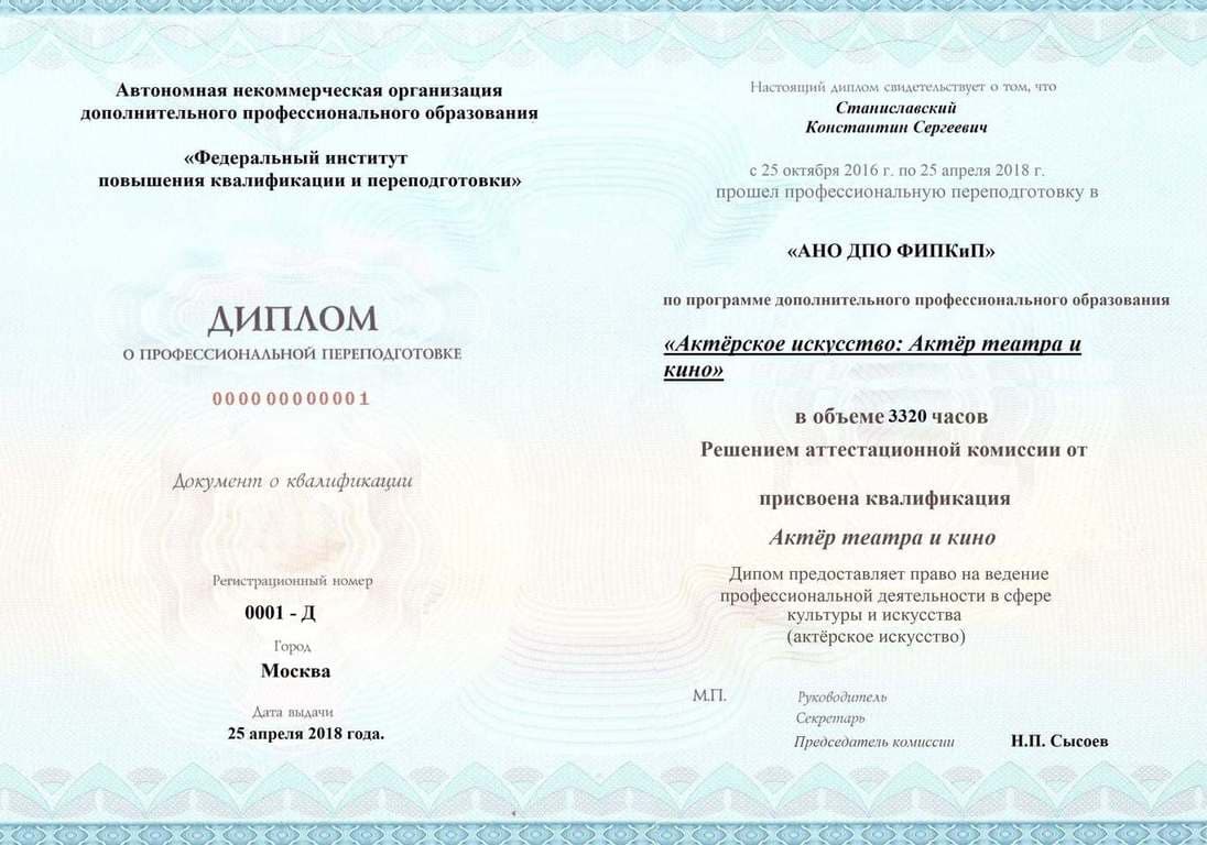 Диплом о профессиональной переподготовке, дающий право на ведение профессиональной деятельности в избранной сфере.