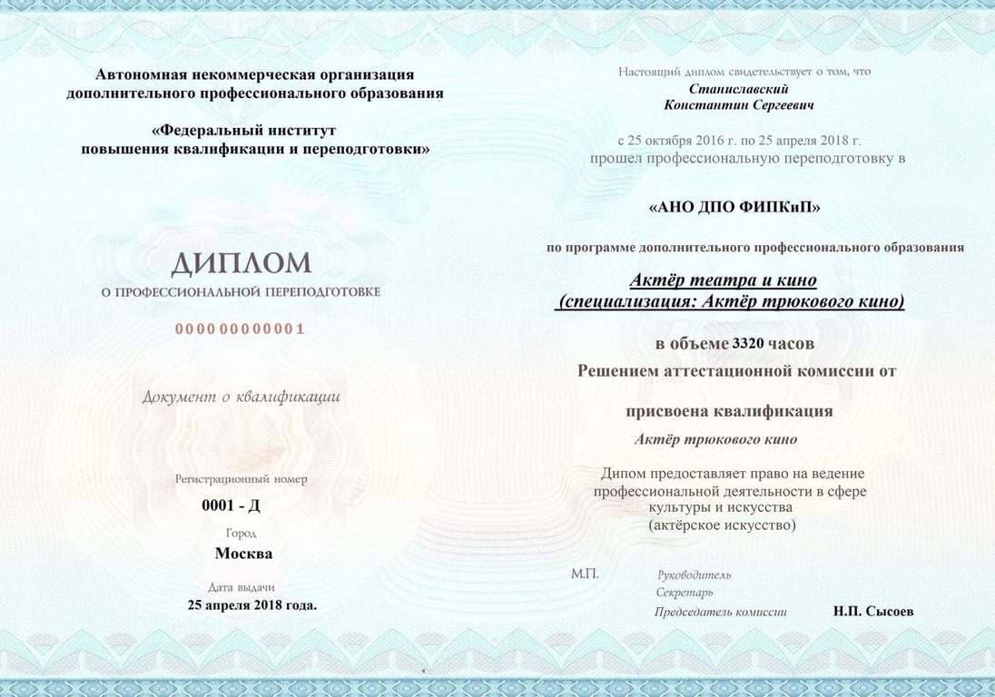 Диплом о профессиональной переподготовке, дающий право на ведение профессиональной деятельности в избранной сфере.