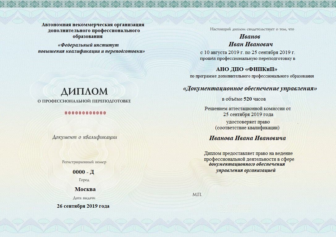 Диплом о профессиональной переподготовке, дающий право на ведение профессиональной деятельности в избранной сфере.