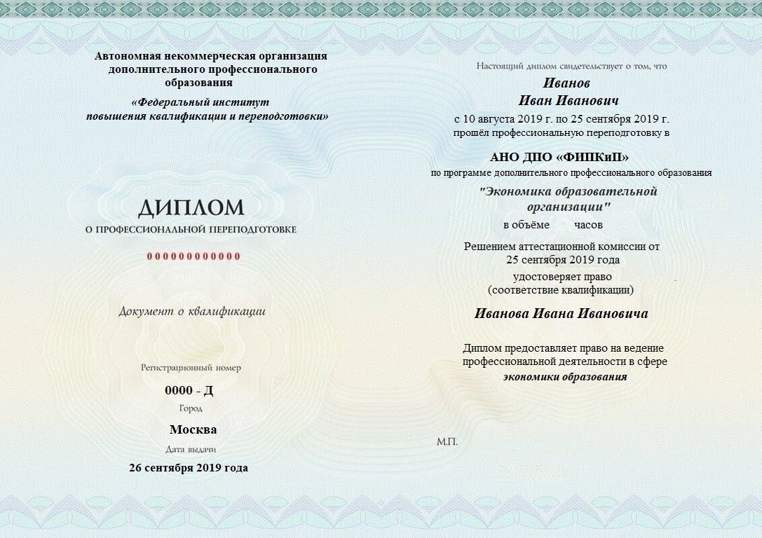 Диплом о профессиональной переподготовке, дающий право на ведение профессиональной деятельности в избранной сфере.