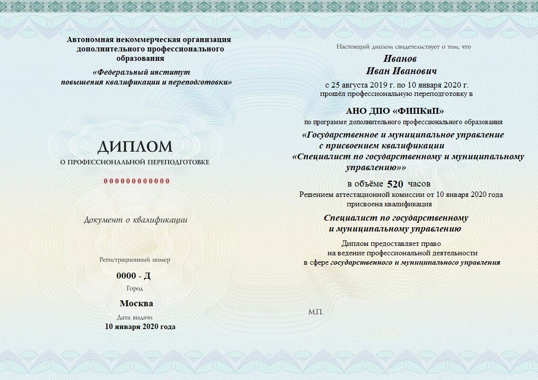Диплом о профессиональной переподготовке, дающий право на ведение профессиональной деятельности в избранной сфере.