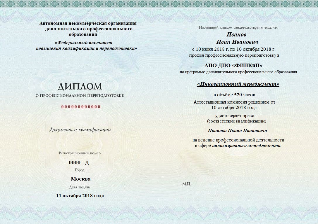 Диплом о профессиональной переподготовке, дающий право на ведение профессиональной деятельности в избранной сфере.