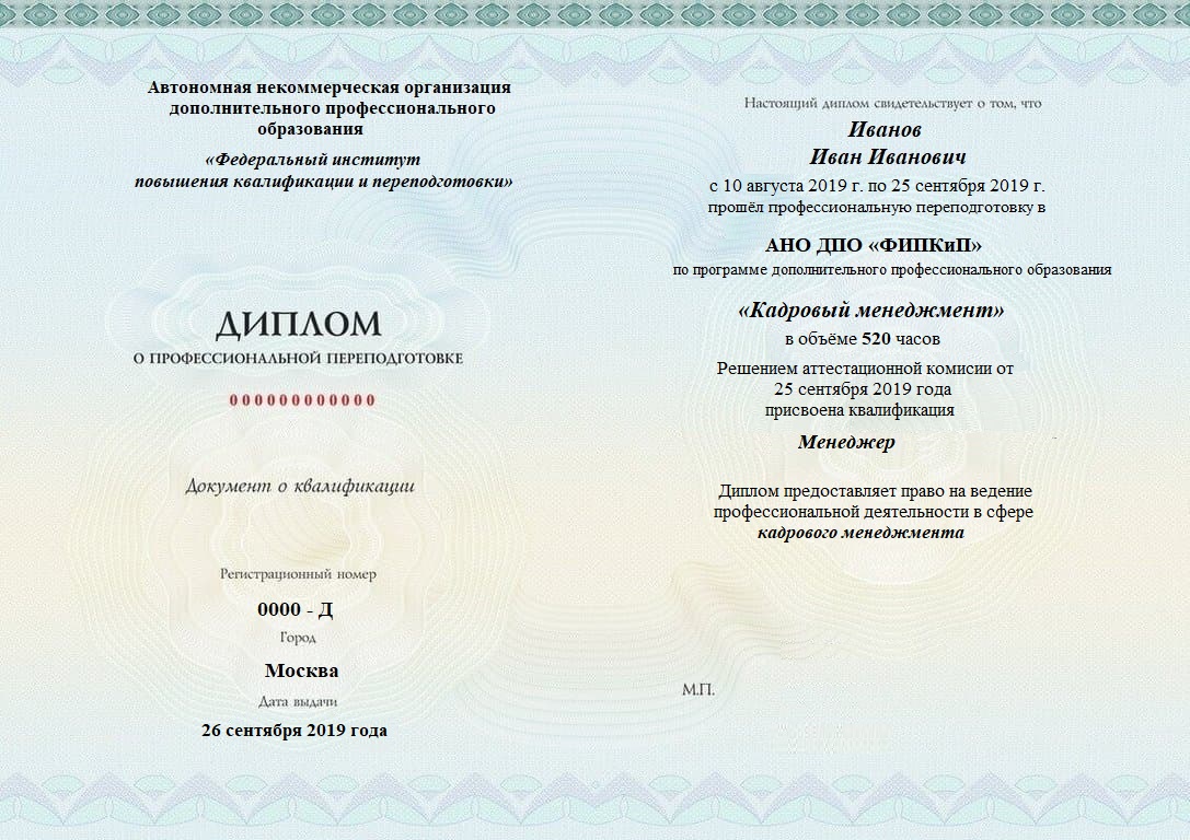 Диплом о профессиональной переподготовке, дающий право на ведение профессиональной деятельности в избранной сфере.