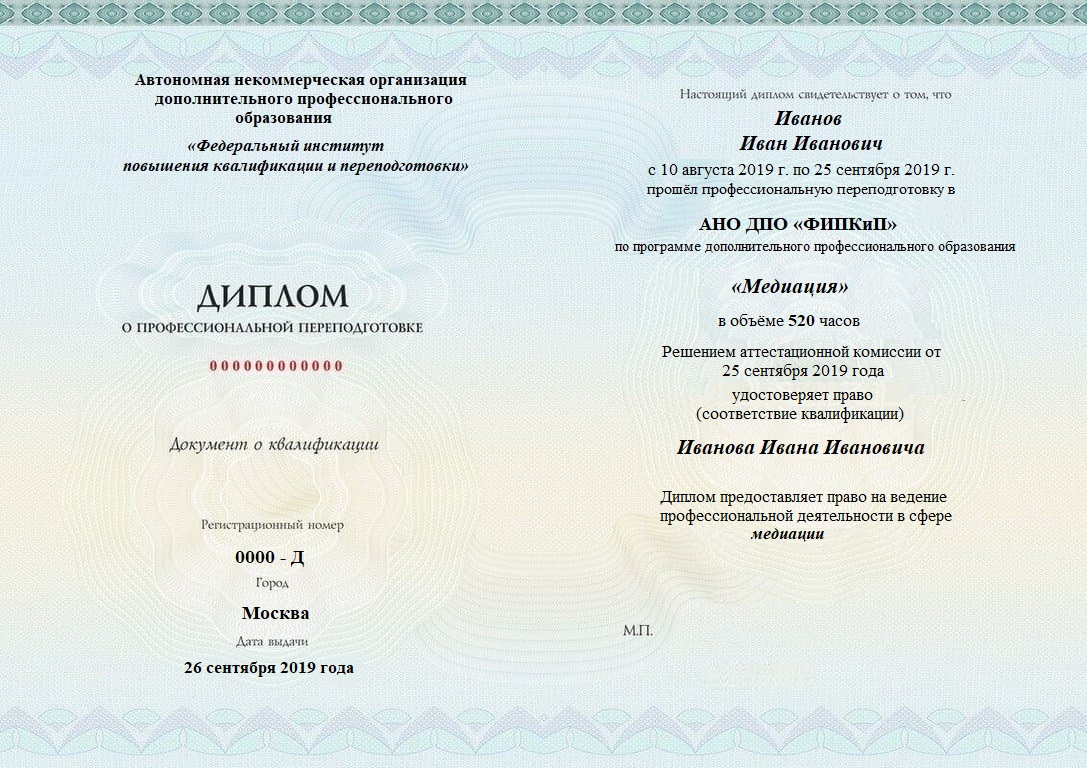 Диплом о профессиональной переподготовке, дающий право на ведение профессиональной деятельности в избранной сфере.
