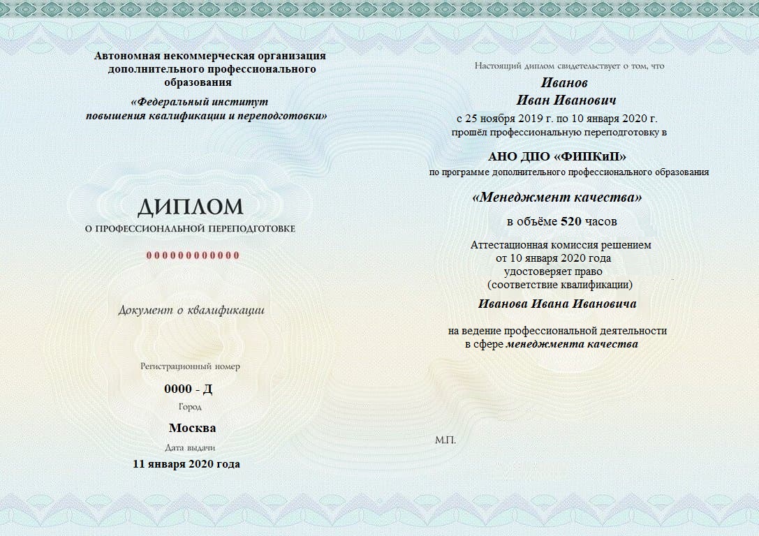 Диплом о профессиональной переподготовке, дающий право на ведение профессиональной деятельности в избранной сфере.