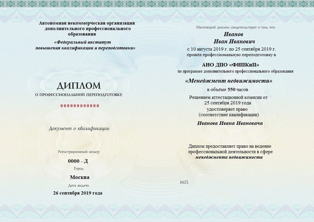 Диплом о профессиональной переподготовке, дающий право на ведение профессиональной деятельности в избранной сфере.