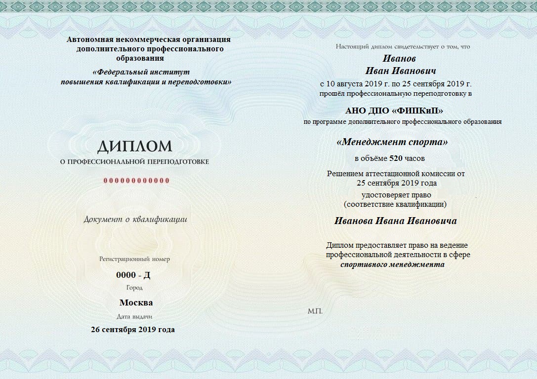 Диплом о профессиональной переподготовке, дающий право на ведение профессиональной деятельности в избранной сфере.
