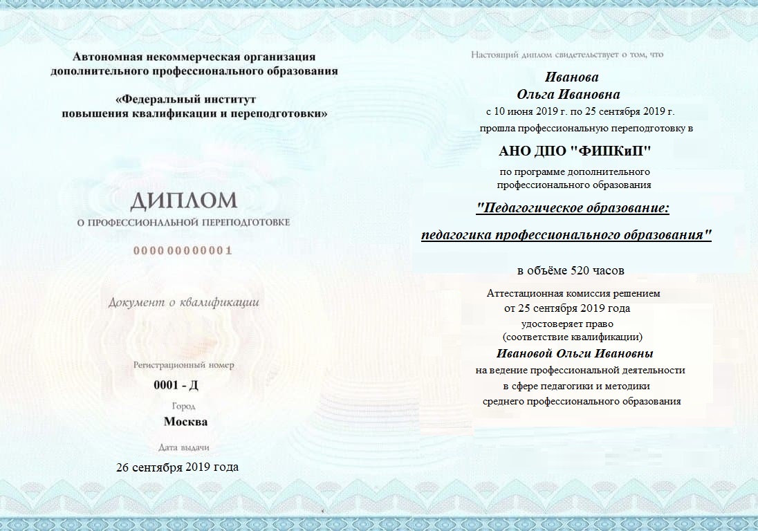 Диплом о профессиональной переподготовке, дающий право на ведение профессиональной деятельности в избранной сфере.