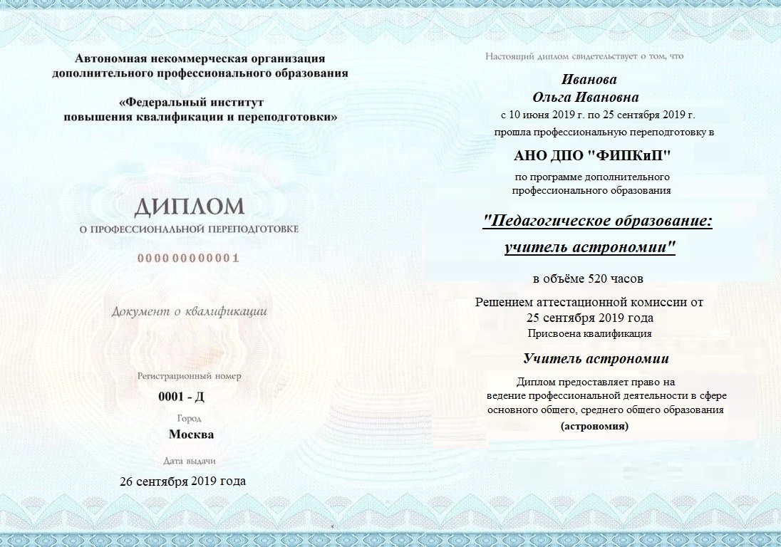 Диплом о профессиональной переподготовке, дающий право на ведение профессиональной деятельности в избранной сфере.