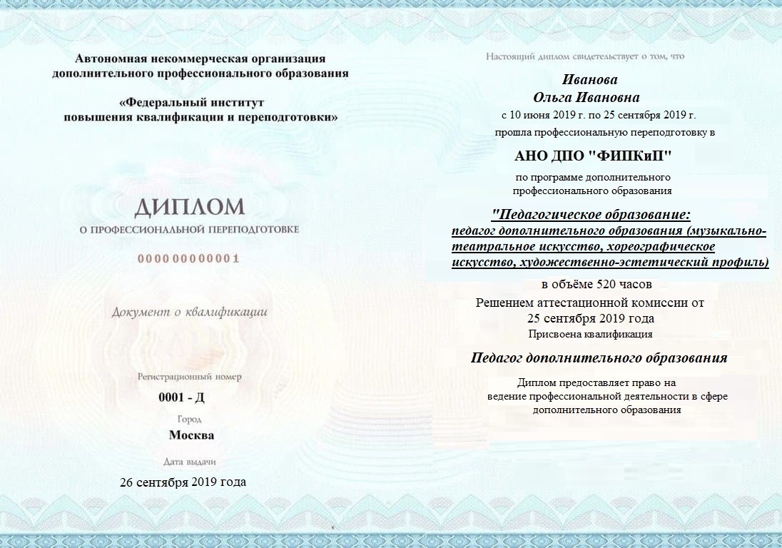 Диплом о профессиональной переподготовке, дающий право на ведение профессиональной деятельности в избранной сфере.