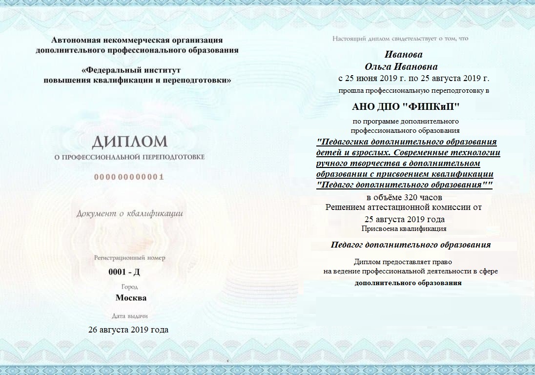 Диплом о профессиональной переподготовке, дающий право на ведение профессиональной деятельности в избранной сфере.