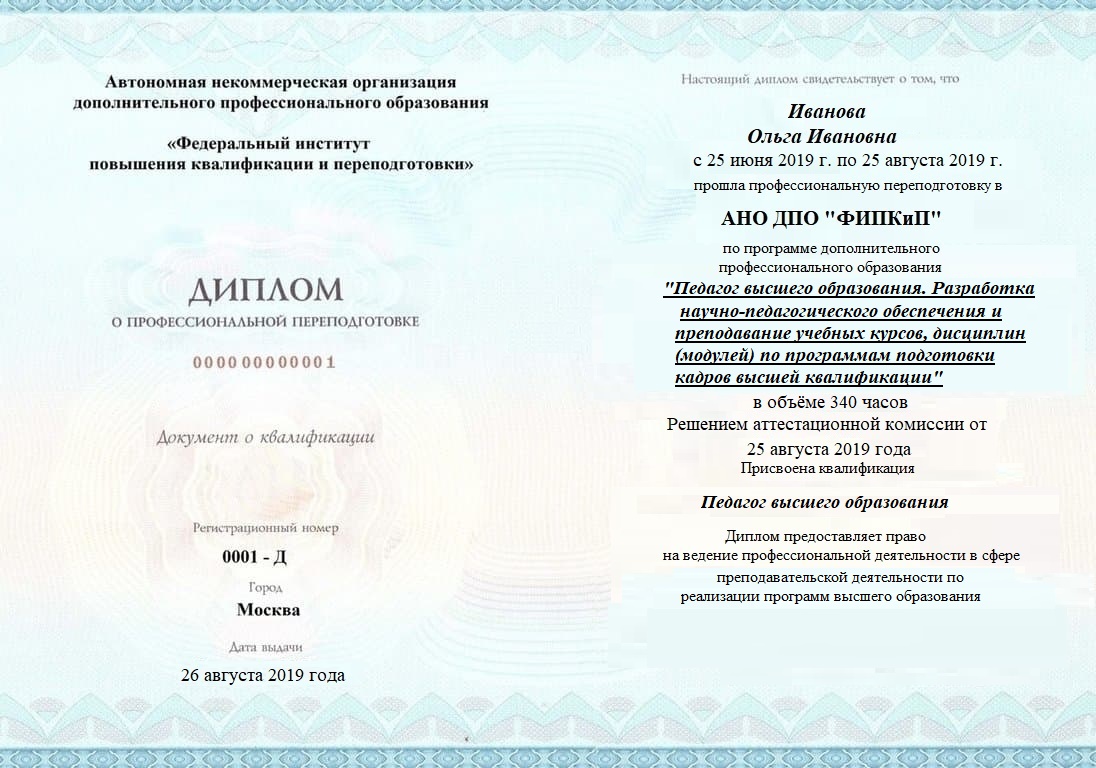 Диплом о профессиональной переподготовке, дающий право на ведение профессиональной деятельности в избранной сфере.