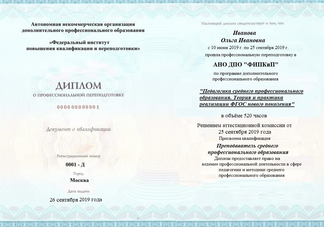 Диплом о профессиональной переподготовке, дающий право на ведение профессиональной деятельности в избранной сфере.