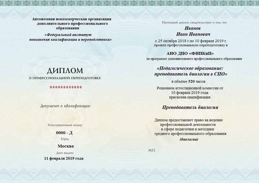 Диплом о профессиональной переподготовке, дающий право на ведение профессиональной деятельности в избранной сфере.