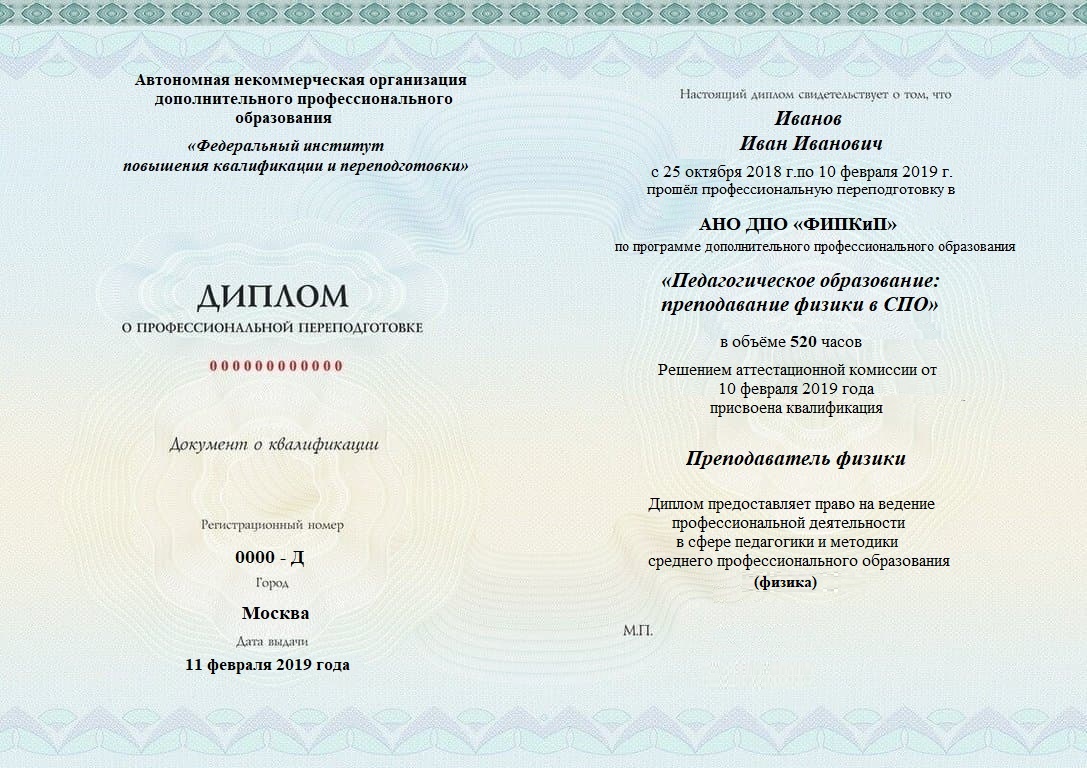 Диплом о профессиональной переподготовке, дающий право на ведение профессиональной деятельности в избранной сфере.