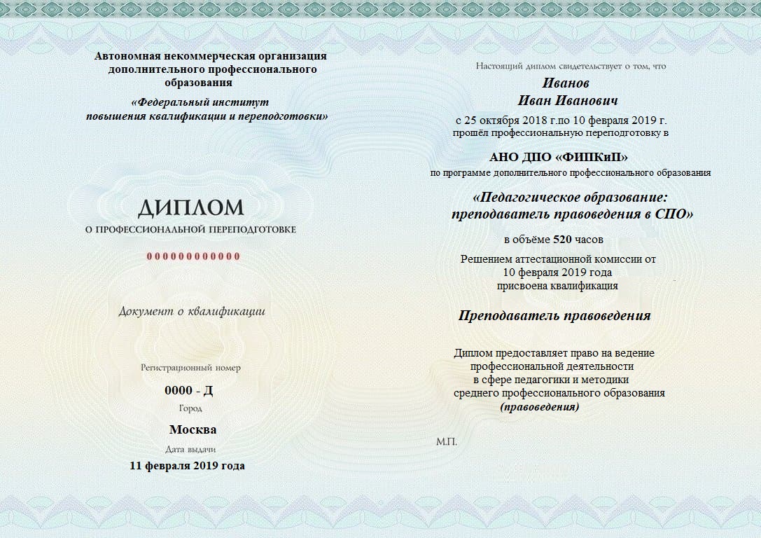 Диплом о профессиональной переподготовке, дающий право на ведение профессиональной деятельности в избранной сфере.