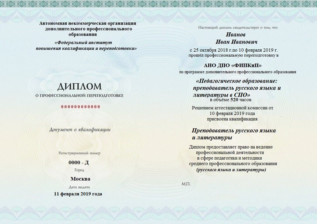 Диплом о профессиональной переподготовке, дающий право на ведение профессиональной деятельности в избранной сфере.
