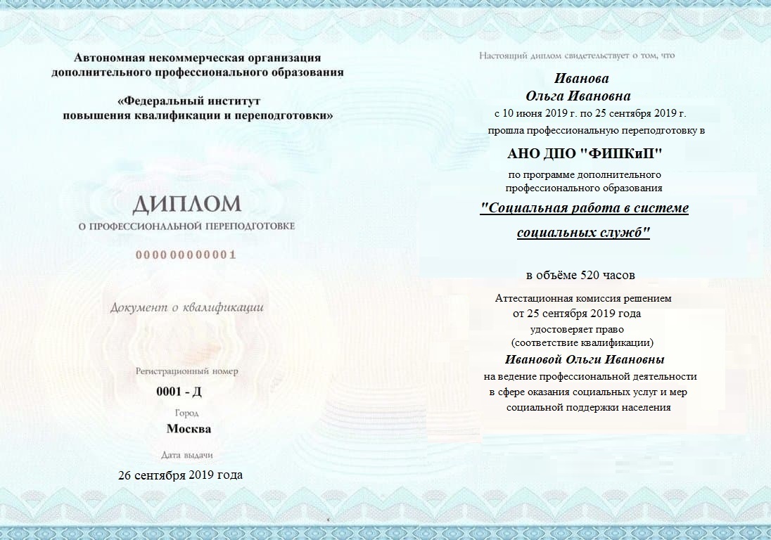 Диплом о профессиональной переподготовке, дающий право на ведение профессиональной деятельности в избранной сфере.