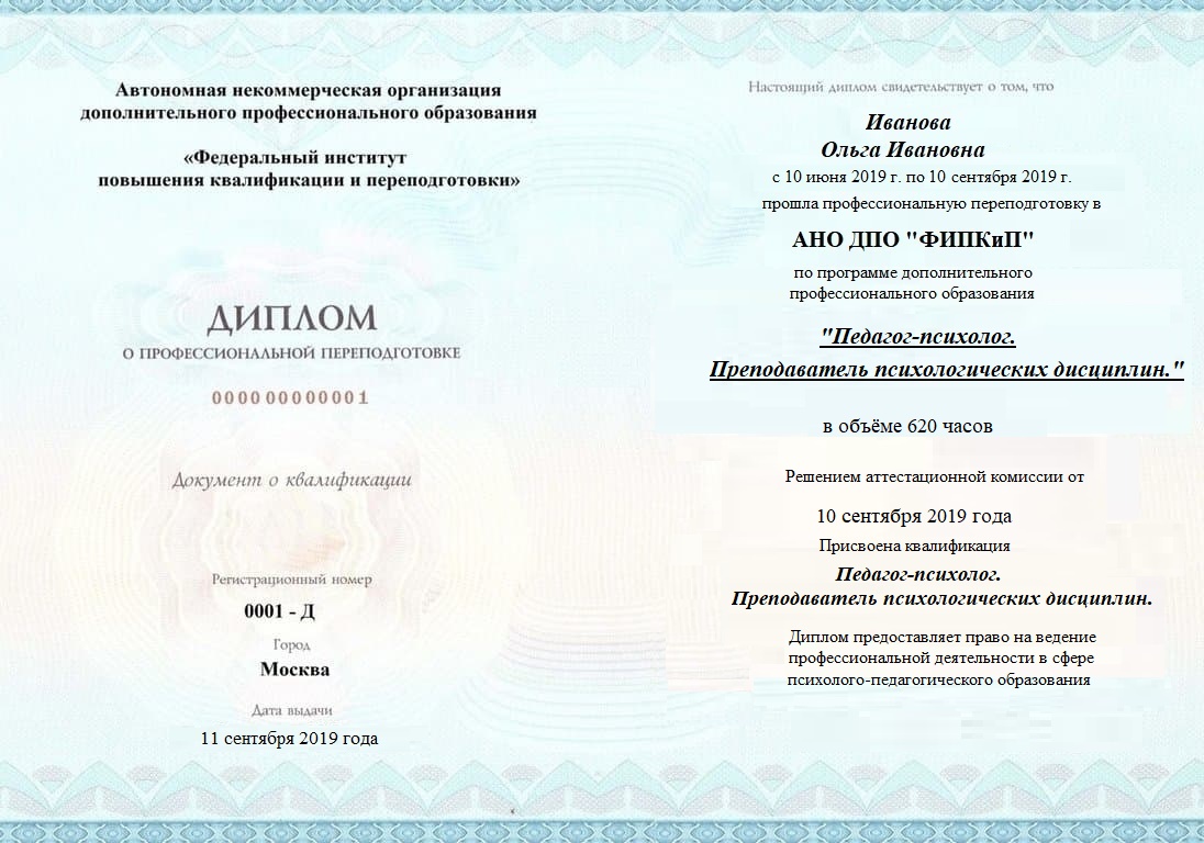 Диплом о профессиональной переподготовке, дающий право на ведение профессиональной деятельности в избранной сфере.
